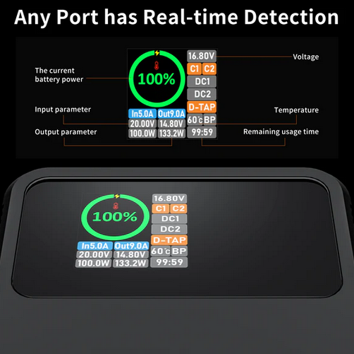 A ZGCINE ZG-X160 V-Mount akkumulátor forradalmasítja az eszközök energiaellátásának felügyeletét és kezelését. Valós idejű érzékelési képességgel rendelkezik bármely porthoz - D-Tap, BP és más - ez az innovatív akkumulátor lehetővé teszi, hogy az 1,3 hüvelykes IPS-képernyőn könnyen nyomon követhesse az áramot, a feszültséget, a teljes teljesítményt, a hátralévő időt, a hőmérsékletet és más kulcsfontosságú információkat.