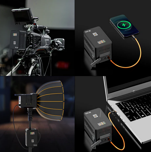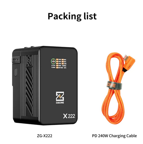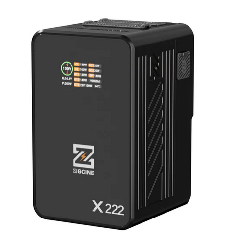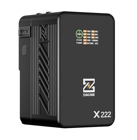 A ZGCINE ZG-X222 egy nagy kapacitású, 222 Wh-s V-mount akkumulátor, kétirányú USB-C PD3.1 140 W-os gyorstöltéssel, amely mindössze 1,5 óra alatt 80%-os töltöttséget ér el. Számos kimeneti porttal rendelkezik, köztük az iparágban elsőként három D-Tap porttal (egy 22 V-os boosttal) és egy 1,4 hüvelykes intelligens digitális kijelzővel a valós idejű teljesítményfigyeléshez.