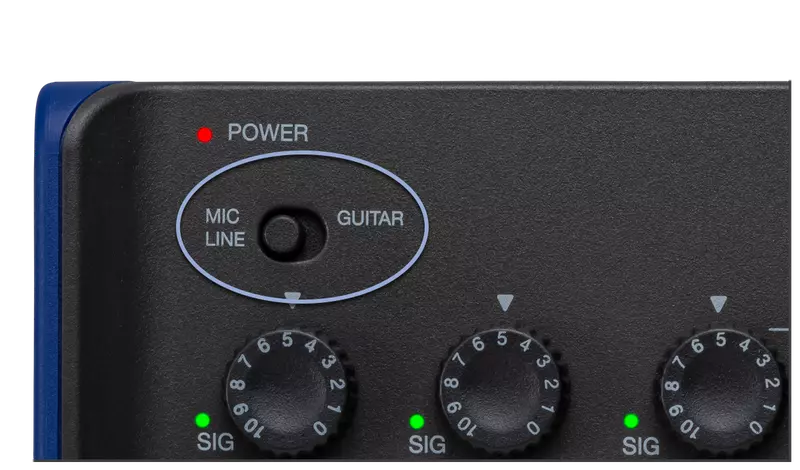 Itt aktiválhatja a Mic/Line vagy Guitar (Hi-Z) üzemmódot az 1 bemenethez.