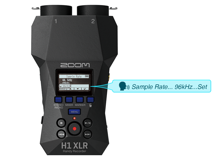 A H1 XLR-t a vakok és gyengénlátók számára készült akadálymentesítéssel tervezték. Navigáljon a menüben hallható leírásokkal a beépített hangszórón vagy fejhallgatón keresztül. Az alkotók választhatnak angol, spanyol, francia, japán, német, olasz vagy kínai nyelvet.