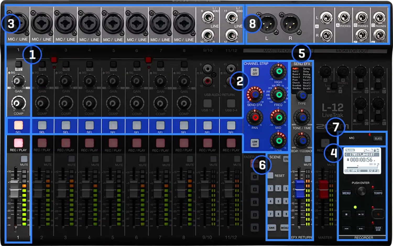 Az L-12-vel akár 12 sávot is rögzíthet 24 bites/96 kHz-es WAV formátumban egy SD-kártyára, és egyidejűleg keverheti élő előadását. A LiveTrak segítségével könnyedén készíthet overdubokat, majd keverheti a kész projektet. Alternatívaként az egyes sávokat elküldheti kedvenc DAW-jébe a későbbi keveréshez és szerkesztéshez. *Az effektek, az equalizer, az overdubolás, az audiointerfész, az A-E fader módok és a 13-14-es csatornák (sztereó keverés) nem állnak rendelkezésre 96 kHz-es frekvencián.
